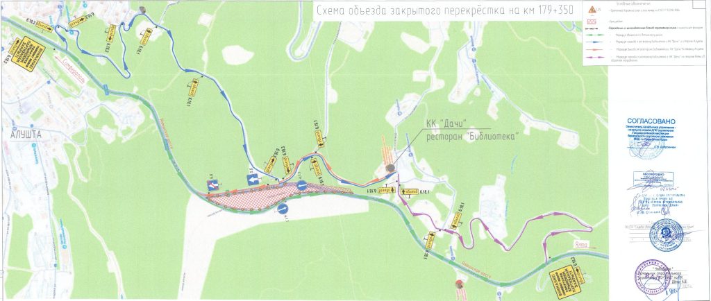 Перекрёсток расположенный на км 179+350 временно закрыт. Проезд к курортному комплексу «Дачи» и ресторану Библиотека осуществляется через примыкания, расположенные на км 178+000 и км 180+800 по представленному маршруту объезда.